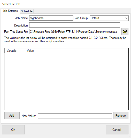 In the dialog box that appears, enter the name of your new job, and select the script you will be running, as shown below: